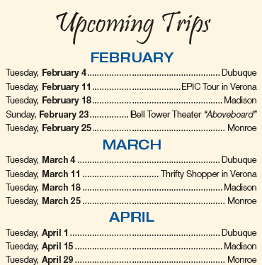 The availability of adequate transportation has long been a priority concern among Lafayette County seniors. The Aging Unit offers two transportation programs. The first program is for “Regular Trips” that are scheduled monthly. Regular trips have a set schedule with approximate times for door to door pick up and drop off. These trips offer shopping, nutrition, social gatherings, medical appointments and business purpose opportunities in Dubuque, Iowa, Madison, Monroe and Platteville, Wisconsin. This program is funded through the Department of Transportation, program income and County funds. For this program, donations are voluntary and confidential. For the general public there is a set fee for service.